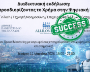 Επερχόμενη Διαδικτυακή Εκδήλωση: «Επαναπροσδιορίζοντας το Χρήμα στην Ψηφιακή Εποχή. FinTech, Τεχνητή Νοημοσύνη και Επιχειρηματικό Οικοσύστημα» Δύο θεματικά πάνελ, ακολουθούμενα από δυο ομαδικές Speed Mentoring με κορυφαίους επαγγελματίες, επιχειρηματίες και επιστήμονες! Σύνδεσμος ZOOM: https://us06web.zoom.us/j/82614925888?pwd=wo5yYOvWaKdaP53qqJyZNBaUgXBZbt.1
