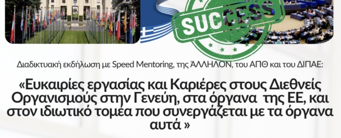 Με επιτυχία πραγματοποιήθηκε την Τετάρτη 1 Απριλίου 2026 η διαδικτυακή εκδήλωση με τίτλο «Επαγγελματική Εμπειρία και Καριέρες στους Διεθνείς Οργανισμούς στη Γενεύη, στα όργανα της Ευρωπαϊκής Ένωσης και στον ιδιωτικό τομέα που συνεργάζεται με τα όργανα αυτά», την οποία συνδιοργάνωσαν η ΆΛΛΗΛΟΝ, το Διεθνές Πανεπιστήμιο της Ελλάδος (ΔΙΠΑΕ) και το Αριστοτέλειο Πανεπιστήμιο Θεσσαλονίκης (ΑΠΘ).